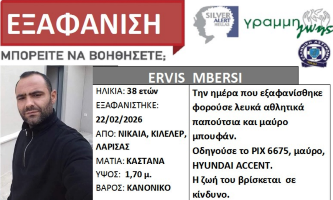 Ο ERVIS MBERSI (ΕΡΒΙΣ ΜΠΕΡΣΙ), 38 ετών, εξαφανίστηκε από το σπίτι του, στην περιοχή της Νίκαιας, στο Κιλελέρ Λάρισας, το πρωί της 22/02/26, με το ΡΙΧ 6675, μαύρο, HYUNDAI ACCENT, ΙΧ αυτοκίνητό του.